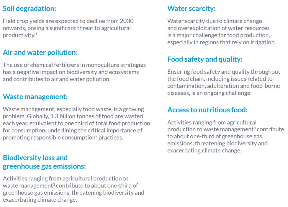 The entire food chain, including production, distribution and consumption, is directly linked to several major challenges: